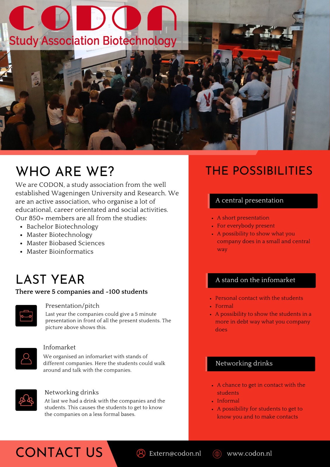 CODON is the study association for all students in biotechnology, bioinformatics, and biobased sciences at Wageningen University & Research. As a study association, it organizes various activities for its members, including lectures, company evenings, symposia, and excursions. One of CODON’s primary goals is to bridge the gap between the job market and students. Currently, the organization has over 750 members within the biotech sector.