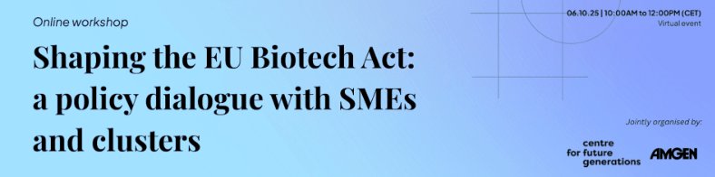 On 6 October 2025 (10:00–12:00 CEST), the Centre for Future Generations (CFG), in partnership with Amgen, is hosting an online workshop to ensure your voice directly informs the upcoming EU Biotech Act.