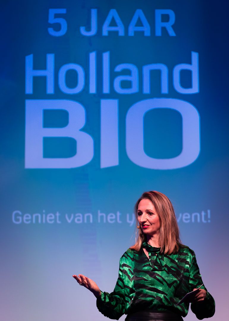 De speech van HollandBIO’s Annemiek sloot naadloos aan. Trots blikte zij terug op de eerste vijf jaar HollandBIO, waarin de vereniging vele successen op haar naam mocht schrijven, maar waaruit ook bleek dat er nog veel werk aan de winkel is. En natuurlijk vooruit: ook de komende vijf jaar gaat HollandBIO er weer vol enthousiasme tegenaan om de weg te effenen voor biotech innovaties. Daarbij is de hulp van onze achterban onmisbaar. Annemiek riep de aanwezigen op om toch vooral de spotlight op te zoeken en onze mooie sector smoel te geven: “Be good & tell it!”.
