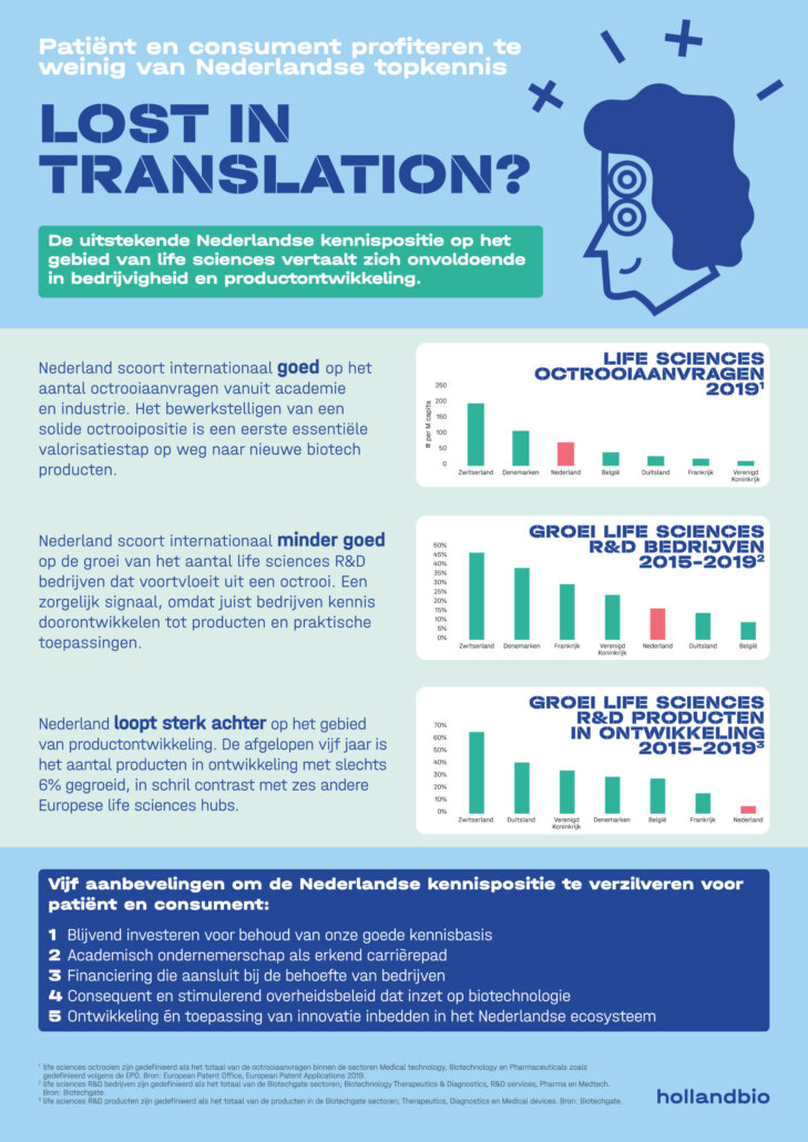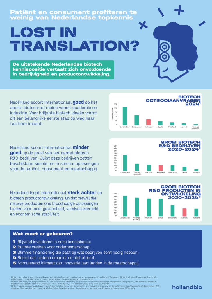 Onderzoek van hollandbio toont aan dat Nederland een goede kennispositie heeft. Helaas blijven de mate van bedrijvigheid en producten in ontwikkeling sterk achter. Alleen wanneer we kennis omzetten in producten die patiënten en consumenten bereiken, realiseren we maatschappelijke relevantie.