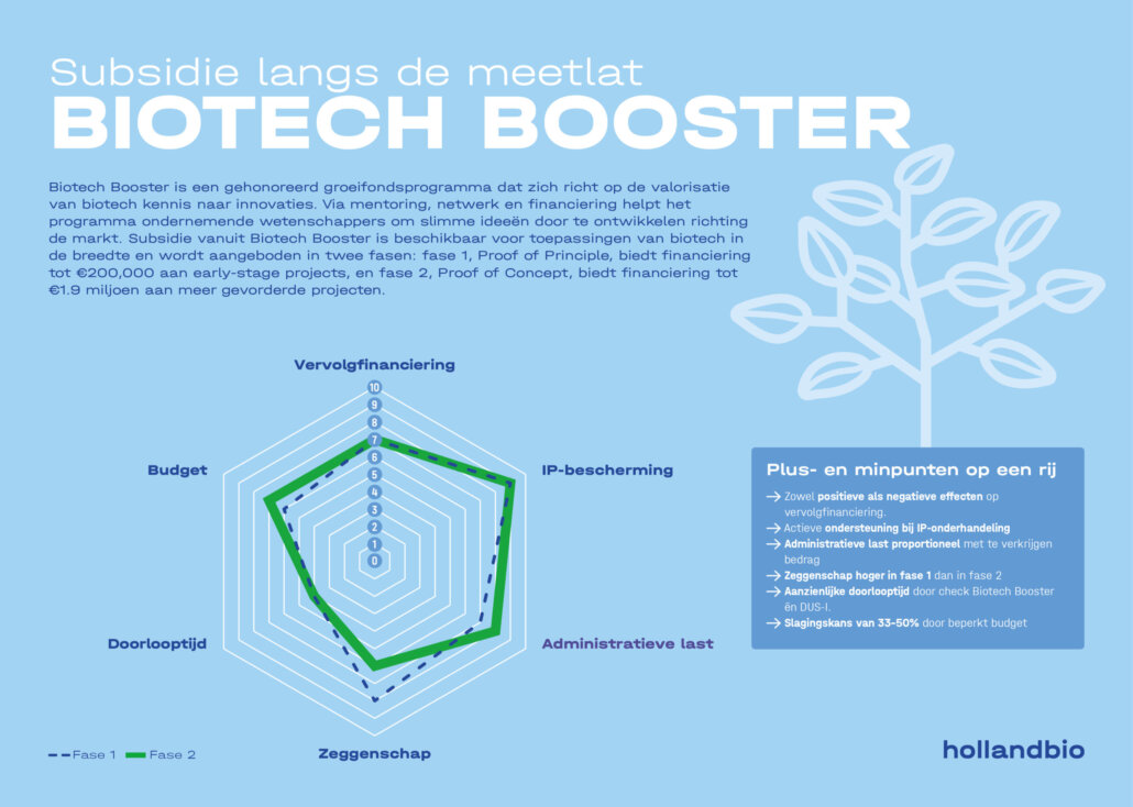 Subsidies spelen een cruciale rol in het mogelijk maken van biotech innovatie, waar ontwikkeltrajecten vaak lang, risicovol en kapitaalintensief zijn. Toch is het voor biotech bedrijven moeilijk een subsidieregeling te vinden die aansluit op hun unieke behoeften. Wat hollandbio betreft voldoet een succesvolle subsidieregeling aan zes voorwaarden. Benieuwd in hoeverre de twee verschillende fasen van Biotech Booster aansluit bij de behoeften van biotech? In een nieuwe infographic scoren we deze subsidies op een schaal van 1 tot 10.