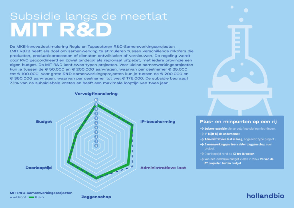 Subsidies spelen een cruciale rol in het mogelijk maken van biotech innovatie, waar ontwikkeltrajecten vaak lang, risicovol en kapitaalintensief zijn. Toch is het voor biotech bedrijven moeilijk een subsidieregeling te vinden die aansluit op hun unieke behoeften. Wat hollandbio betreft voldoet een succesvolle subsidieregeling aan zes voorwaarden. Benieuwd in hoeverre de MKB-innovatiestimulering Regio en Topsectoren R&D-Samenwerkingsprojecten (MIT R&D) aansluit bij de behoeften van biotech? In een infographic scoren we deze subsidie op een schaal van 1 tot 10.