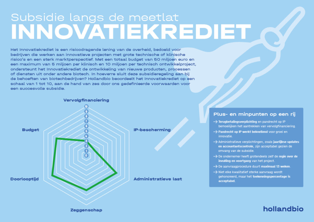 Subsidies spelen een cruciale rol in het mogelijk maken van biotech innovatie, waar ontwikkeltrajecten vaak lang, risicovol en kapitaalintensief zijn. Toch is het voor biotech bedrijven moeilijk een subsidieregeling te vinden die aansluit op hun unieke behoeften. Wat hollandbio betreft voldoet een succesvolle subsidieregeling aan zes voorwaarden. Benieuwd in hoeverre het Innovatiekrediet aansluit bij de behoeften van biotech? In een nieuwe infographic scoren we deze subsidie op een schaal van 1 tot 10.